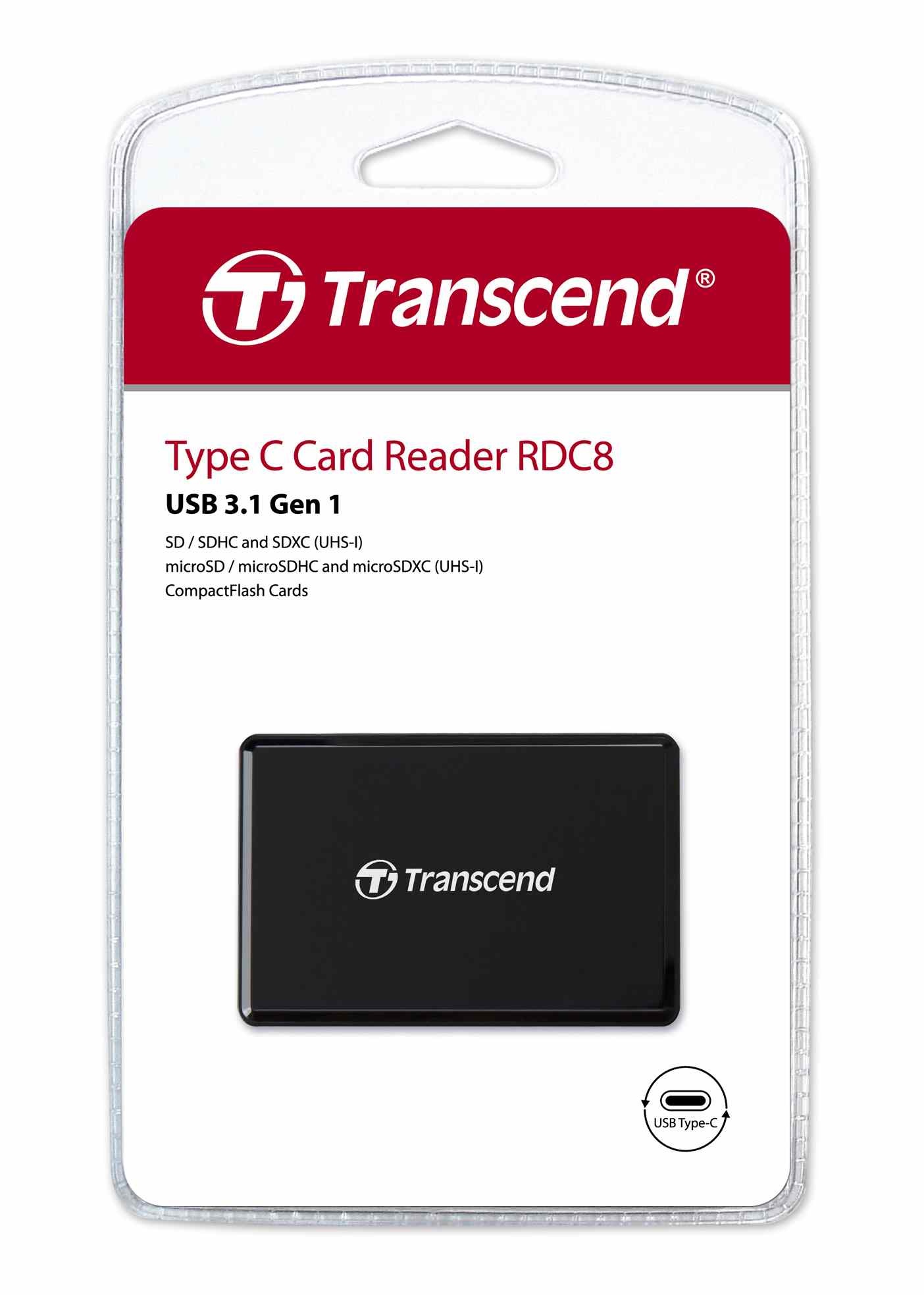Transcend's RDC8 card reader is equipped with four slots for SD memory cards, microSD memory cards, CompactFlash cards, and Memory Stick memory cards, offering you a convenient way to transfer different types of digital files with one compact card reader.