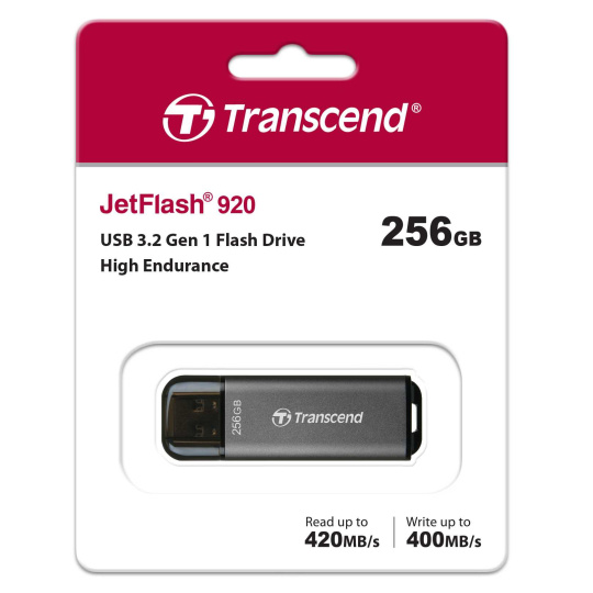 Introducing Transcend's high endurance, high performance JetFlash 920, a USB flash drive that is anything but ordinary. Boasting sensational read speeds of up to 420MB/s and write speeds of up to 400MB/s, the JetFlash 920 delivers top-notch performance in a sleek and portable design. Its aluminum metallic housing will safeguard your data wherever you go.