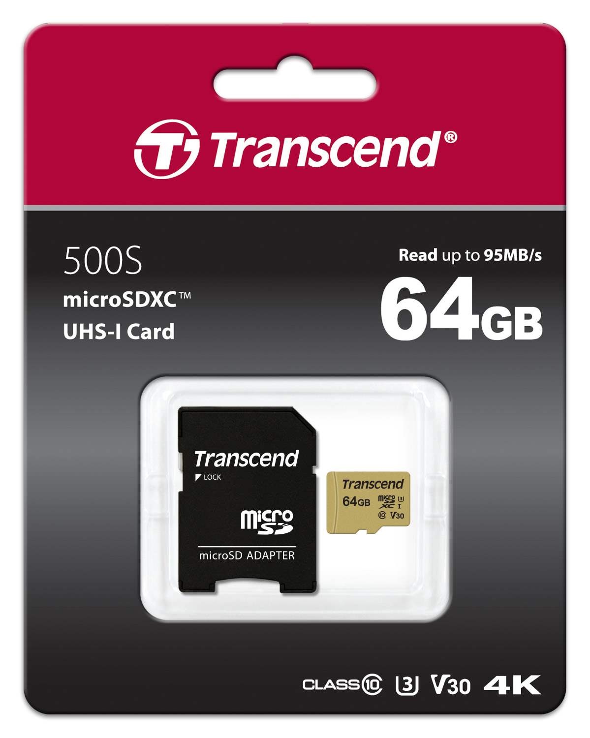 Transcend's microSDXC/SDHC 500S memory cards meet both the UHS Speed Class 3 (U3) and the UHS Video Speed Class 30 (V30) standards for 4K Ultra HD video recordings, with read/write speeds of up to 95MB/s and 60MB/s respectively.