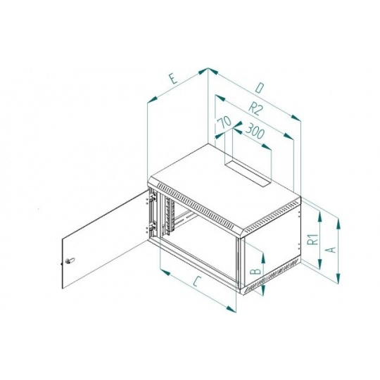 Rozvaděč Delta B je celosvařený nástěnný jednodílný rozvaděč s celoskleněnými dveřmi, které je možné díky masivním pantům otevřít pod úhlem téměř 180°. Důležitou součástí výrobku jsou otvory pro kabely, které jsou umístěny na horní a dolní stěně. Další dva otvory jsou umístěny na zadní stěně rozvaděče. Otvory jsou zaceleny vylamovacími záslepkami, které je možné vylomit s pomocí např. šroubováku. 19“ zařízení se instalují na vertikální lišty, které je možné plynule natavit podle potřeby do hloubky těla rozvaděče. Díky perforaci je zajištěna přirozená cirkulace vzduchu a chlazení komponentů. Přesné rozměry a další technické údaje jsou uvedeny níže (hodnoty R1 a R2 označují rozteče montážních otvorů pro zavěšení rozvaděče na zeď). Maximální zatížení rozvaděče je 30 kg. Rozměry: A – 280 mm B – 175 mm C – 490 mm D – 600 mm E – 395 mm R1 – 234 mm R2 – 420 mm Hmotnost – 12,4 kg Příbal: Klíč - přední dveře 2x Vrut 6x50 4x Podložka 6,6 4x Hmoždinka 10 4x Plastová podložka 8x Plovoucí matice M6 8x Šroub M6x16 8x Protiprachová záslepka 1x.