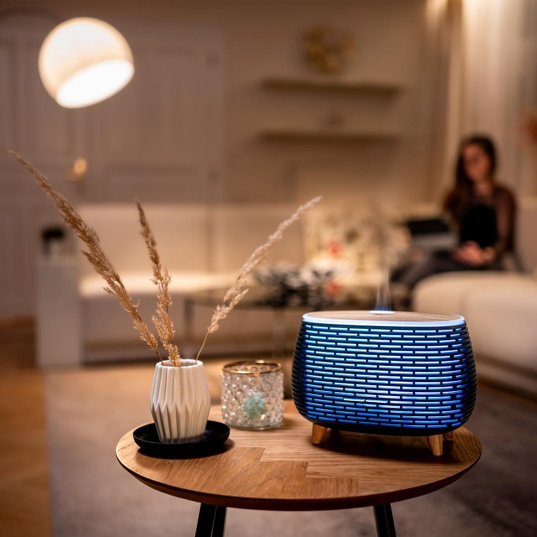 Terapie vůní i barvami vás uvolní, zklidní nebo třeba naopak nastartuje vaši produktivitu. Nádržku o objemu 400 ml stačí naplnit vodou pro zvlhčení vzduchu nebo přidat několik kapek esenciálního oleje a užívat si aromaterapeutických účinků. Ambientní osvětlení nabízí 7 barev nastavitelných v různých režimech, od statických barev po plynulé přechody mezi všemi barvami. Dokonale tak vyladíte atmosféru dle svých potřeb.