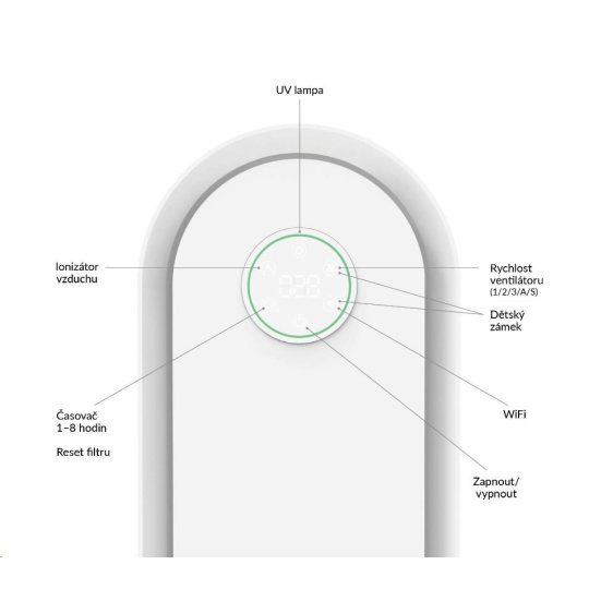 Ovládání čističky vzduchu je velmi jednoduché a intuitivní. Všechny funkce lze nastavit pomocí ikon na dotykovém displeji.
