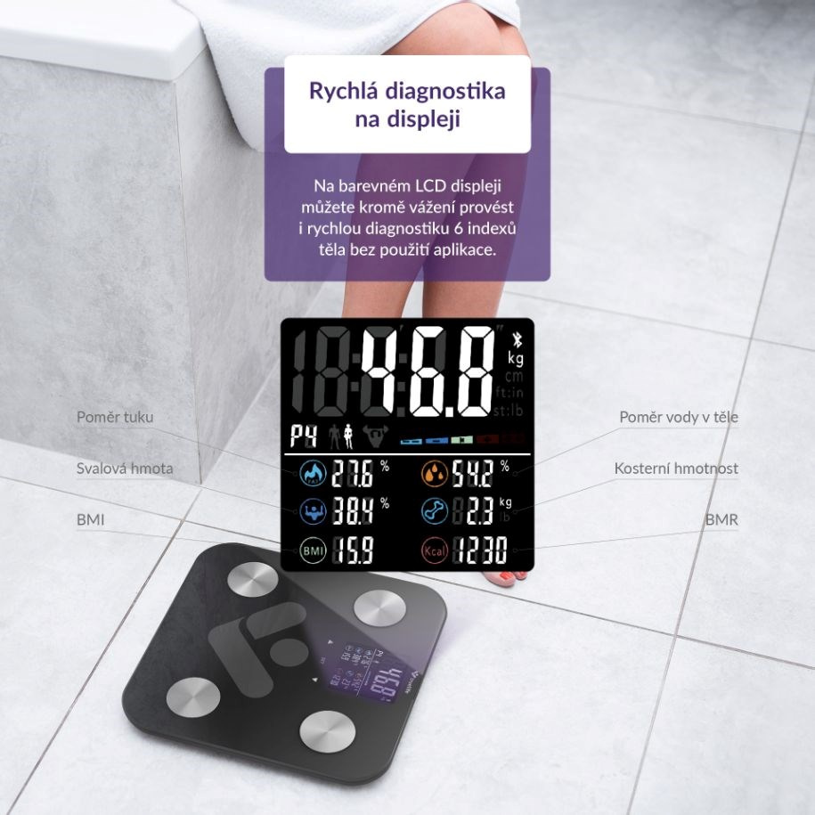 I bez mobilní aplikace na displeji okamžitě vidíte analýzu 7 indexů vašeho těla.