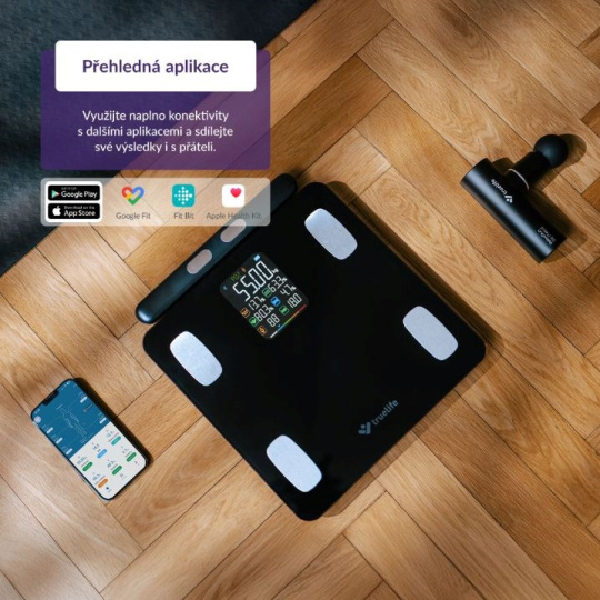 TrueLife FitScale W8 BT Black pomocí Bluetooth snadno propojíte s aplikací, která je kompletně v češtině, přináší řadu výhod a rozšiřuje možnosti osobní váhy. Během vážení se údaje automaticky s aplikací synchronizují, a to až pro 16 uživatelů. Přehledný report pak nabízí 15 indexů těla s detailním vysvětlením a doporučením týkajícím se stravy a cvičení, jak postupovat k vytyčenému cíli. Z 15 posledních měření vytvoří aplikace i grafy a statistiky, aby byl vývoj zřetelnější. Data lze synchronizovat také s aplikacemi Moving life, Apple Health, Google Fit a Fitbit.