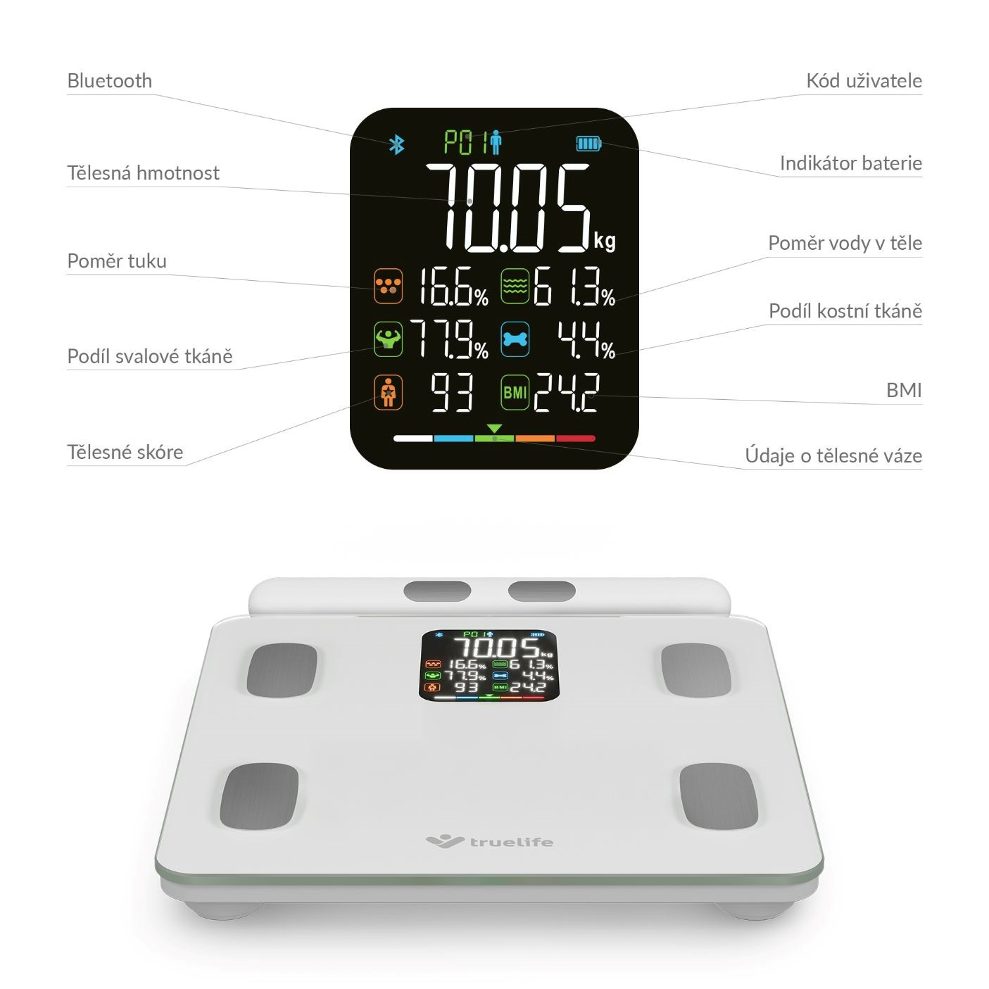 Zjistěte o svém těle více než jen pouhou hmotnost. Každý jsme originál a jedinečnou skladbu má i naše tělo, proto o něm chytrá váha TrueLife FitScale W8 BT White prozradí detaily. Technologie TrueLife PrecisionIQ+® využívá 8 vysoce citlivých senzorů a s pomocí bioelektrické impedanční analýzy změří celkovou tělesnou kompozici. Na přehledném barevném LCD displeji zobrazí celkem 7 údajů - kromě hmotnosti také třeba procento tuku, svalů či vody. Propojením přes Bluetooth s aplikací získáte přehledný report zahrnující 15 tělesných indexů včetně jejich popisu. Váha je schopna sledovat až 16 uživatelů, u kterých v aplikaci zaznamená 15 posledních měření. Každého uživatele automaticky rozezná, takže není třeba nic přepínat. Kdokoliv má však možnost použít váhu i bez aplikace. Prémiové tvrzené krycí sklo je elegantní a velmi odolné s nosností až 180 kg. Při vážení si můžete zvolit jednotky, a to buď kilogramy nebo libry. Vážící odchylka činí pouhých 0,1 kg, takže vaše výsledky budou opravdu přesné.