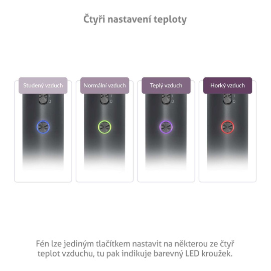 Tlačítko fénu je opatřeno barevným LED kroužkem, který ukazuje aktuálně nastavenou teplotu. Studený vzduch značí modrá barva, normální vzduch zelená barva, teplý vzduch má barvu fialovou a horký vzduch červenou.