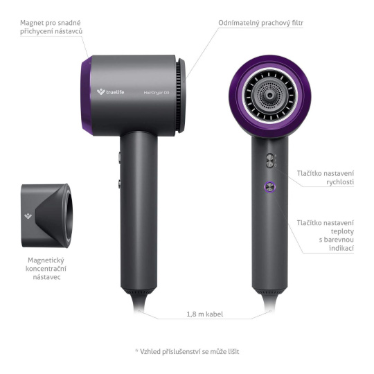 Fén TrueLife HairDryer D3 pracuje díky výkonnému motoru s technologií TrueLife UltraFlow® rychlostí až 20 000 otáček za minutu, přitom však o vlasy pečuje jako profesionální kadeřník. Ke krásným a zdravým vlasům přispívá také ionizátor s technologií TrueLife UltraIonic® vyzařující přibližně 40 milionů záporných iontů působících i uvnitř vlasu. Díky tomu stačí vysoušet kratší dobu a na nižší teplotu, jejíž aktuální nastavení indikuje barevný LED kroužek okolo tlačítka, kde modrá barva indikuje studený vzduch, zelená normální, fialová teplý a červená horký vzduch.
