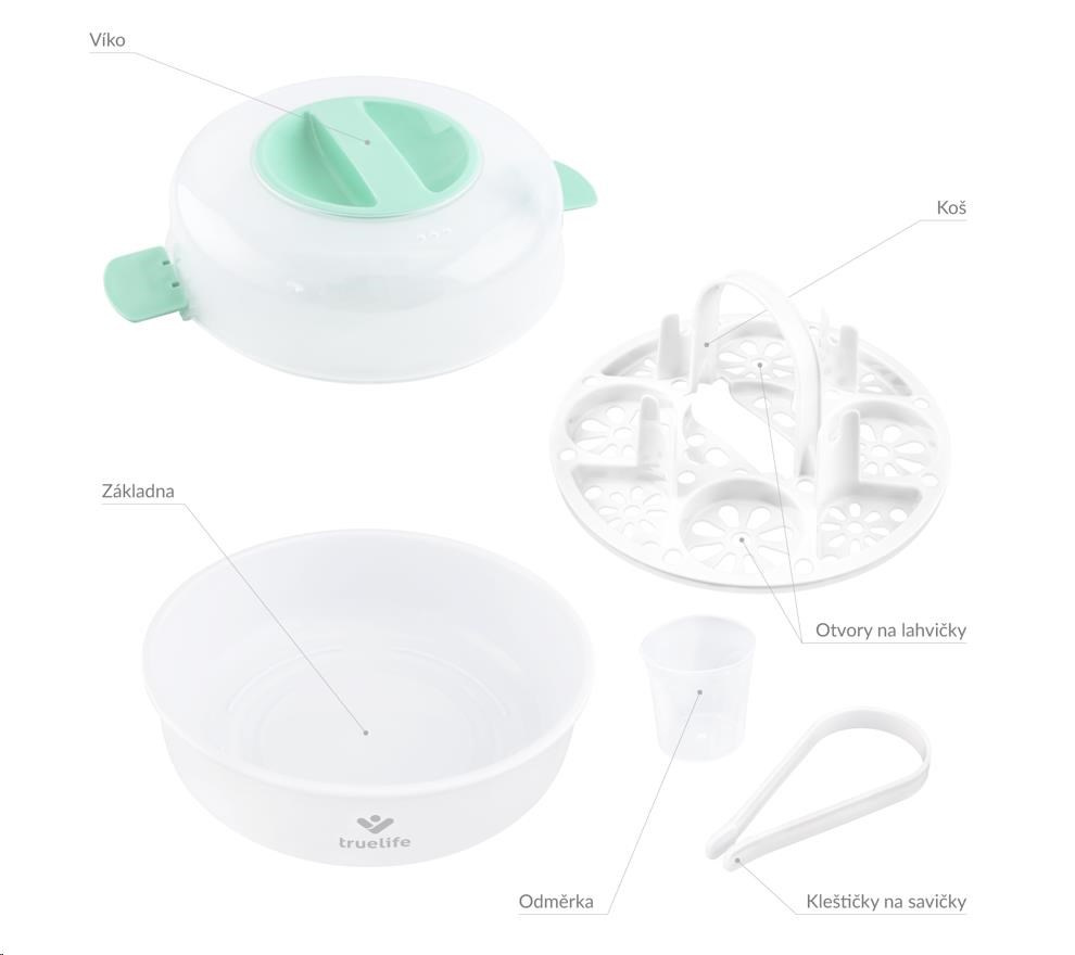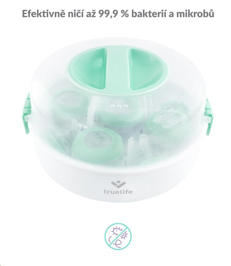 Ochrana imunitního systému vašeho dítěte pro vás nemusí znamenat neustálé vyvařování lahviček a dudlíků. Se sterilizátorem do mikrovlnné trouby TrueLife Invio MS5 sterilizujete dětské lahvičky, kousátka a další předměty během dvou minut. K tomu potřebujete jen obyčejnou vodu a mikrovlnou troubu. Sterilizátor využívá nemocniční metodu parní sterilizace, která je rychlá, účinná a bez chemických látek. Ničí tak 99,9 % bakterií a mikrobů, které se na dětských předmětech nacházejí, aniž by poškodil jejich povrch. Sterilizátor je navržen pro většinu mikrovlnných trub na trhu a zvládne většinu typů kojeneckých lahví. Pojme až 5 lahviček naráz a snadno se ovládá. Díky kompaktním rozměrům s ním můžete bez problému cestovat.