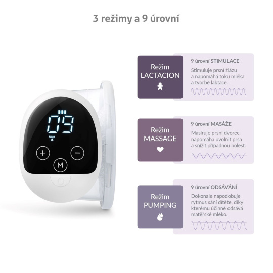 Odsávačka disponuje 3 režimy: Stimulace napomáhá toku mléka a tvorbě laktace, masáž prsního dvorce uvolňuje prsa a snižuje případné bolesti, odsávání dokonale napodobuje rytmus sání dítěte pro účinné odsátí mléka.