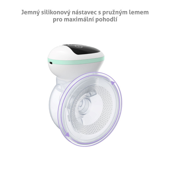 Přiložení odsávačky k prsu je příjemné díky měkkému nástavci z jemného silikonu, který se prsu krásně přizpůsobí a je šetrný k pokožce.