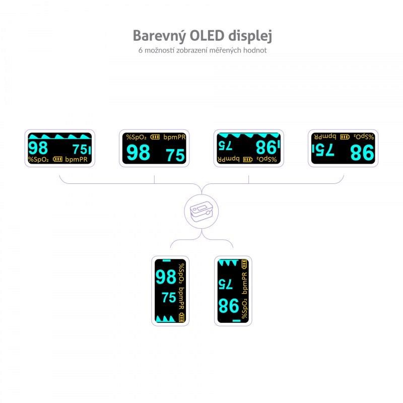 Oxymetr X3 disponuje přehledným OLED displejem, jehož nastavení lze přizpůsobit dle vašich preferencí. Na výběr je 6 možností zobrazení měřených hodnot. Nastavit můžete i preferovanou intenzitu jasu, zvukový indikátor, či zvukový doprovod tepu.