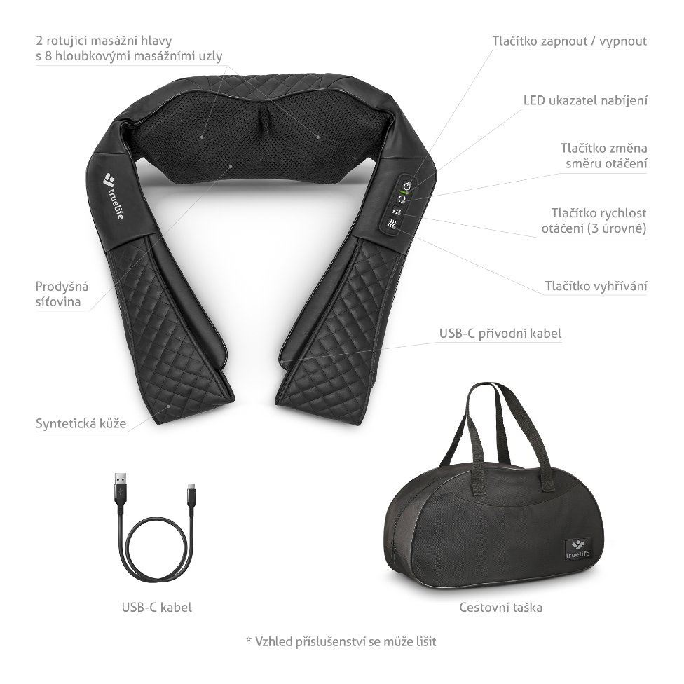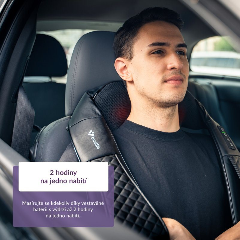Uspěchaná doba, hektický životní styl a často sedavá zaměstnání našemu zdraví nepřidávají. Proto se nesmíme zapomínat i trochu hýčkat. Právě pro tyto okamžiky přichází na scénu TrueLife RelaxBack B6 Charge, masážní přístroj, jenž napomáhá zmírňovat bolesti zad a šíje, regenerovat svaly a uvolňovat napětí a stres. Přístroj disponuje vyhříváním, které lze využít jako tepelnou terapii pro zklidnění bolavých svalů a zlepšení krevního oběhu. Masážní hlavy mají 3 úrovně rychlosti otáčení. Dvě rotační hlavice se čtyřmi nahřívacími hloubkovými masážními uzly poskytují pocit jako při masáži Shiatsu. Přístroj lze díky jeho ergonomickému designu ve tvaru U použít pro masáž celého těla, k čemuž přispívají také 3D rotační hnětací masážní uzly. Speciální držáky na ruce umožňují více stáhnout masírované místo pro větší účinnost. Časovač je nastaven na 15 minut masáže, přičemž každou minutu automaticky dochází ke změně směru otáčení. Přístroj má vestavěnou baterii s výdrží až 2 hodiny na jedno nabití, takže jej bez problémů lze používat i v autě. Jeho provoz je tichý a údržba snadná, stačí otřít hadříkem. Praktická je též cestovní taška.