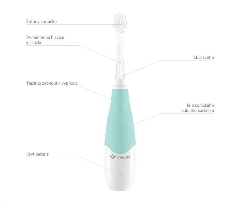 Na pravidelnou péči o zoubky by si měly zvykat i nejmenší děti. Ovšem přesvědčit vaše dítě, aby si dobrovolně čistilo zuby, může být občas oříšek. Většina dětí si čištění zubů příliš neužívá a tak ho často jen tak odbyde. Se sonickým kartáčkem Truelife SonicBrush Baby G, který je uzpůsoben potřebám dětí od 3 do 6 let, může být ale čištění zubů i zábava. Díky 30 samolepkám zvířátek a zábavné výukové video animaci snadno proměníte rutinní činnost v legraci a vaše dítě se bude na čištění zubů těšit. Kartáček je plně přizpůsoben dětským potřebám, tělo i hlavice kartáčku mají vhodnou velikost pro dětská ústa a štětiny kartáčku jsou pro děti dostatečně jemné. Kartáček je napájen z obyčejné AAA baterie, takže s ním můžete pohodlně cestovat.