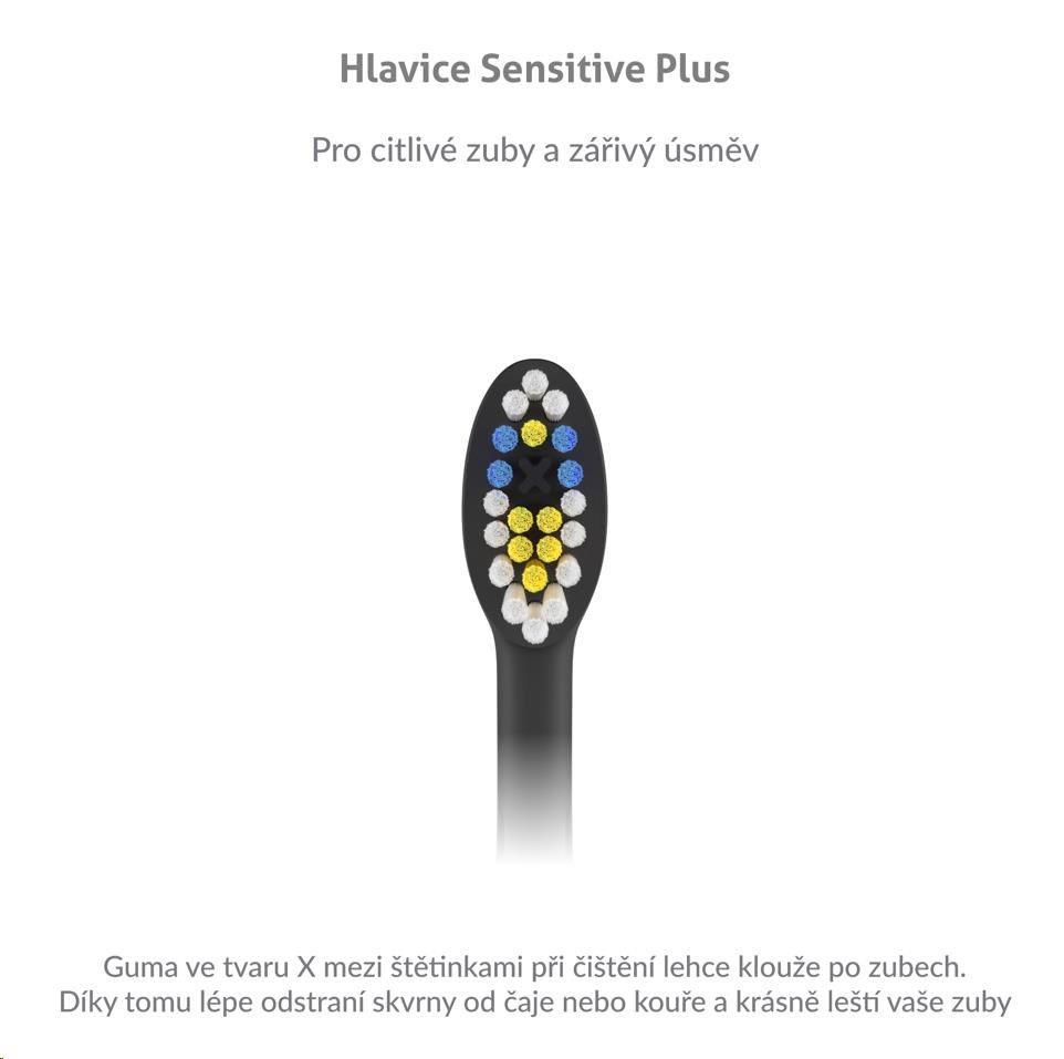 Náhradní hlavice jsou speciálně vyvinuty pro citlivé zuby. Guma ve tvaru X mezi štětinkami při čištění lehce klouže po zubech. Díky tomu lépe odstraní skvrny od čaje nebo kouře a krásně leští vaše zuby.