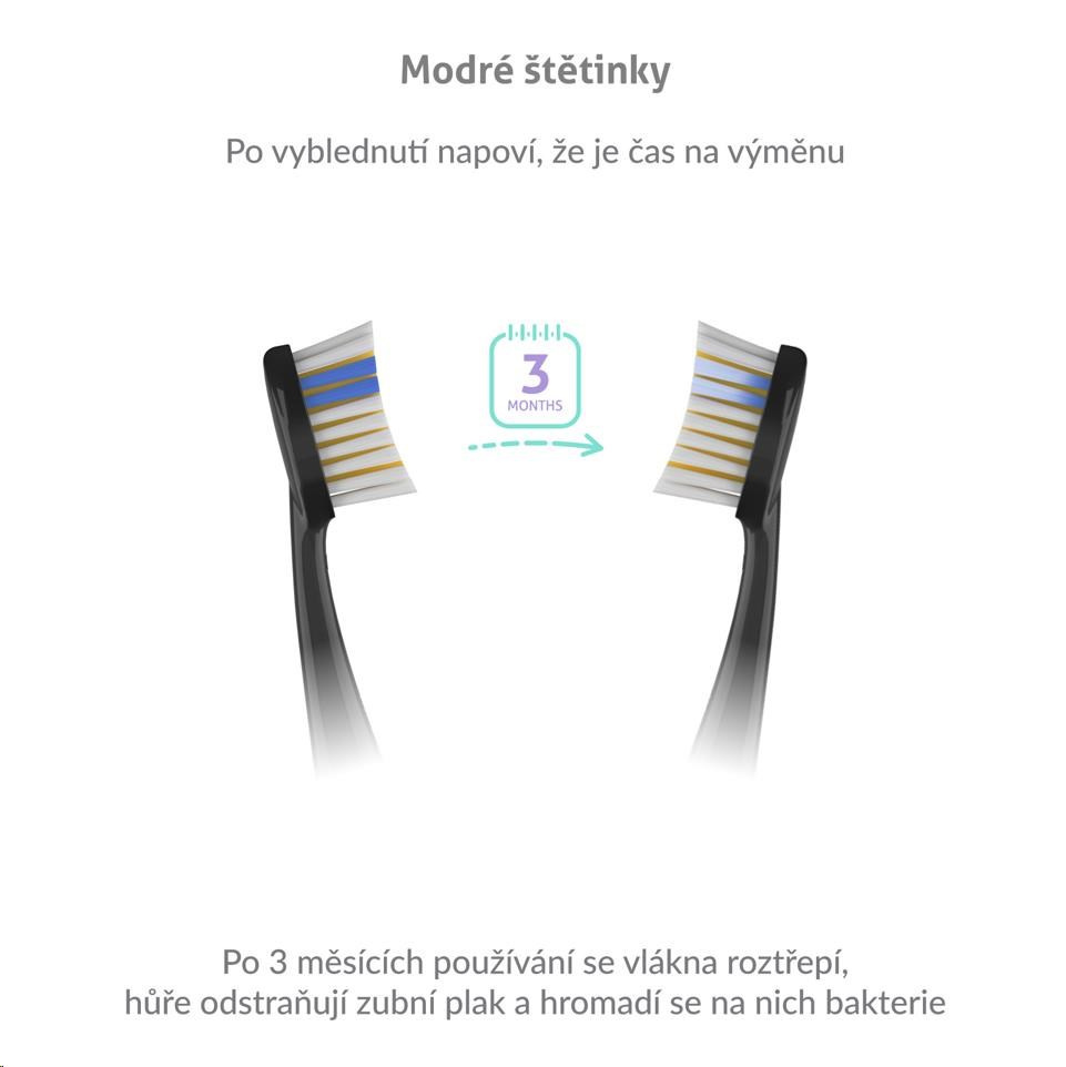 Hlavice vydrží až 3 měsíce používání, poté se začnou třepit, ztrácí účinnost a navíc se na nich hromadí bakterie. Naštěstí jsou hlavice opatřeny modrými štětinami, které po 3 měsících vyblednou a vy tak víte, že je načase hlavice vyměnit.