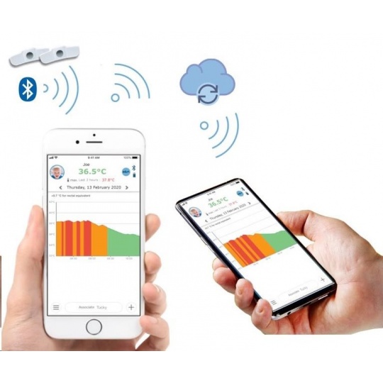 Pro maximální omezení vyzařování je TUCKY vybaven technologií „Bluetooth Low Energy“ s dosahem až do vzdálenosti 10 metrů (v závislosti na překážkách). Pokud se nacházíte mimo tento rozsah, záznam měření teploty se synchronizuje v certifikovaném zdravotnickém „cloudu“, což vám umožní bezpečný přístup k vašim datům v reálném čase a uchová v paměti všechny dosavadní měření. Při použití druhého zařízení s Bluetooth je dosah neomezený, kdy se v místnosti, nebo v dosahu ponechá jedno smart zařízení pro přenos dat do aplikace přes cloud. Přes druhé smart zařízení (smartphone, tablet) následně budete moct monitorovat teplotu na prakticky neomezenou vzdálenost. Vyzařovaní vln je cca 1000x nižší než u smartphonu, nebo 250x nižší než u běžné dětské chůvičky.