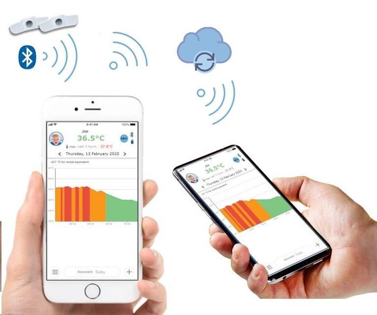 Pro maximální omezení vyzařování je TUCKY vybaven technologií „Bluetooth Low Energy“ s dosahem až do vzdálenosti 10 metrů (v závislosti na překážkách). Pokud se nacházíte mimo tento rozsah, záznam měření teploty se synchronizuje v certifikovaném zdravotnickém „cloudu“, což vám umožní bezpečný přístup k vašim datům v reálném čase a uchová v paměti všechny dosavadní měření. Při použití druhého zařízení s Bluetooth je dosah neomezený, kdy se v místnosti, nebo v dosahu ponechá jedno smart zařízení pro přenos dat do aplikace přes cloud. Přes druhé smart zařízení (smartphone, tablet) následně budete moct monitorovat teplotu na prakticky neomezenou vzdálenost. Vyzařovaní vln je cca 1000x nižší než u smartphonu, nebo 250x nižší než u běžné dětské chůvičky.
