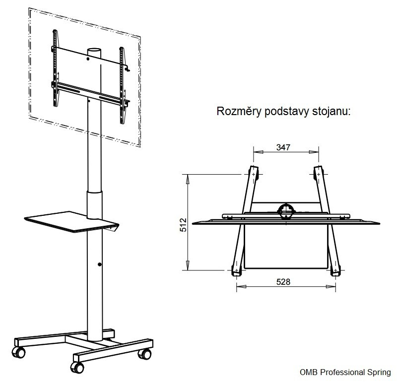 Tv stojan OMB Professional Spring Televizní stojan s plynovou pružinou pro snadné a rychlé nastavení výšky 140-170cm bez nářadí, nosnost 40kg, VESA 100x100 až 600x400, na televizory a monitory 32" až 65" Profesionální stojan robustní, velmi pevné, bezpečné a stabilní konstrukce, který má uvnitř nosníku integrovanou plynovou pružinu pro možnost velmi snadného nastavení výšky obrazovky bez nutnosti použití jakéhokoliv nářadí, navíc neskutečně rychle a pohodlně. Plynová pružina zajistí po stlačení bezpečnostní páčky plynulé vyjetí obrazovky do horní pozice, v případě potřeby snížit výšku stačí zatlačit na obrazovku. Regulovat výšku je možné v rozmezí 140cm až 170cm (výška stojanu po střed obrazovky). Stojan je ideální na televizory a monitory s hmotností do 40kg, které podporují jakýkoliv VESA standard v rozmezí 100x100 až 600x400mm včetně. Doporučená úhlopříčka je 32" až 65", ale je možné použít i větší obrazovky až do úhlopříčky 65". Podstavec stojanu je osazen kvalitními pojezdovými kolečky, které zajišťují vynikající mobilitu. Televizní stojan OMB Professional Spring dodáváme v černém provedení. Televizní stojan s nastavením výšky a kolečky OMB Professional Spring Technické údaje: max. zatížení 40kg podpora VESA standardu 100x100 až 600x400 doporučená úhlopříčka zavěšené obrazovky 32" až 65" nastavitelná výška stojanu v rozmezí 1400 až 1700mm integrovaná plynová pružina pro snadné a rychlé nastavení výšky bez použití nářadí možnost dokoupení police na příslušenství OMB Shelf Handy s rozměry 447x300mm nosnost police na příšlušenství 5kg robustní, velmi pevná konstrukce profesionální kvalita bezpečný, stabilní stojan barevné provedení černé záruka 3 roky Televizní stojan s plynovou pružinou pro snadné a rychlé nastavení výšky v rozmezí 140 až 170cm, nosnost 40kg, VESA standard 100x100 až 600x400 - OMB Professional Spring Televizní stojan OMB Professional Spring podporuje VESA standardy: VESA 100x100 VESA 200x100 VESA 200x200 VESA 300x200 VESA 300x300 VESA 400x200 VESA 400x300 VESA 400x400 VESA 600x400 Na Tv stojan je možné zavěsit všechny typy televizorů a monitorů, které mají hmotnost do 40kg a podporují kterýkoliv z výše uvedených VESA standardů. Velikost televizoru není podstatná, pouze doporučujeme minimální úhlopříčku 32", ideálně 37" a větší. Na televizní stojan OMB Professional Spring je možné dokoupit polici na příslušenství OMB Shelf Handy s nosností 5kg: Police na příslušenství ke stojanu OMB Professional Spring - OMB Shelf Spring Díky vynikajícímu řešení nastavitelné výšky pomocí plynové pružiny zvládne nastavování výšky bez jakéhokoliv nářadí a námahy kdokoliv. Stojan je ideální pro využití na prezentacích, výstavách, přednáškách, konferencích, čekárnách a kdekoliv pro komerční i nekomerční účely..
