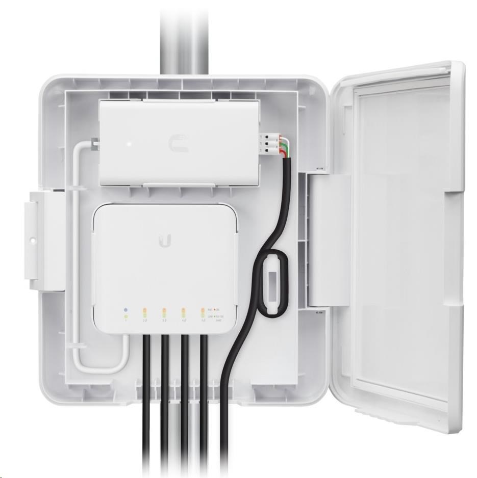 USW-Flex-Utility je venkovní krabice odolná proti povětrnostním vlivům speciálně navržená pro použití s UniFi Switch Flex (USW-Flex) zařízením. USW-Flex-Utility lze snadno namontovat na jakýkoliv sloup, poskytuje naprosto jednoduchou správu kabelů a zabezpečení šroubem.