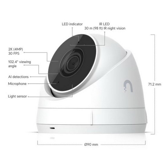 Popis produktu UniFi Protect UNVR-Instant-Kit je prodáván jako kit záznamového zařízení včetně 1TB 3,5'' HDD a 4 ks kamer UVC G5 Turret Ultra. K NVR je možné připojit až 15 kamer v HD rozlišení, 8 kamer s 2K rozlišením nebo 6 kamer ve 4K. NVR je vybaveno gigabitovým uplink portem a 6 gigabitovými porty s podporou PoE napájení 802.3af, které slouží pro připojení kamer. Napájení NVR je ze sítě 230V AC a jeho maximální spotřeba bez připojeného příslušenství a kamer je 9 W. Kamery UVC G5 Turret Ultra s rozlišením 4MP (2688 x 1512) jsou vybaveny fixním objektivem, který má pozorovací úhel 102,4° horizontálně a 54,9° vertikálně. Kamery disponují mikrofonem a 10/100Mbps ethernetovým portem, který slouží i k napájení kamery přes POE 802.3af nebo pasivní POE se vstupním napětím 37 - 57 V DC. Pro noční režim kamera využívá IR přísvit s dosahem 30 m. Maximální spotřeba činí pouze 4 W. Klíčové vlastnosti • UNVR-Instant + 1TB 3.5'' HDD + 4 UVC G5 Turret Ultra • Vše v jednom pro snadnou instalaci • Uložení záznamu na 3.5" pevný disk 1 TB (součást balení) • Možnost montáže kamer na zeď, strop (držák součástí balení) Obsah balení • NVR • (4) kamera UVC G5 Turret Ultra • (1) 3,5" HDD s kapacitou 1 TB • Montážní podložka • Montážní příslušenství Technické parametry Kamera Typ objektivu:Fixní Dosah přísvitu [m]:30 Obrazový senzor ["]:1/2.4 Obraz Rozlišení:4MP Max. rozlišení [pixely]:2688 x 1512 Max. rozlišení kamer pro záznam:8MP Konektory a rozhraní Audio:Mikrofon Rychlost LAN:(7) 10/100/1000Mbps HDMI rozhraní:Ano Napájení Napájení přes PoE:802.3af Typ napájení:Ze sítě (230V) Podporované PoE-Out standardy:802.3af Počet PoE Out portů:6 PoE budget [W]:40 Max. spotřeba energie [W]:4 Fyzické charakteristiky Stupeň krytí:IP66 Provedení:Desktop Použití:Venkovní Tlačítka:Reset Provozní teplota [°C]:0 až 40 Hmotnost [g]:1040 Šířka [mm]:47 Výška [mm]:47 Hloubka [mm]:220 Hardware Počet podporovaných IP kamer:15 Počet podporovaných HDD:1 Obecné Kamerová řada:UniFi Protect.