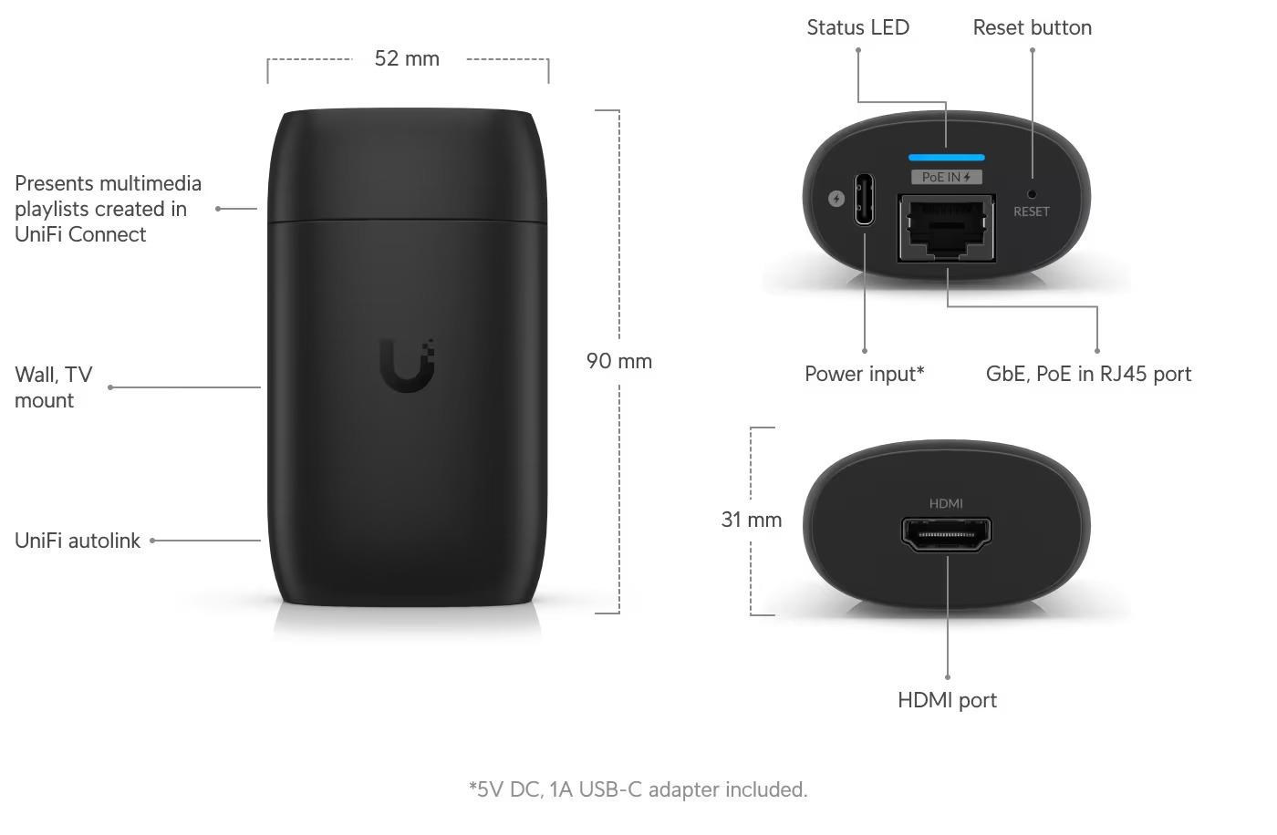 Popis produktu Ubiquiti UC-Cast je zařízení určené k přehrávání videí a fotografií na televizi či monitoru přes HDMI. Může být napájeno buď pomocí POE (Power over Ethernet) nebo přes rozhraní USB-C. Zařízení disponuje interním úložištěm o kapacitě 16 GB pro uložení vašich médií. Pro přehrávání videí je možné využít síťové připojení, neboť je vybaven LAN portem s rychlostí až 1 Gb/s. Klíčové vlastnosti • Rychlost přenosu až 1 Gb/s • Možnost napájení přes POE nebo USB-C • Streamování skrze síť • Úchyt na zeď v balení Obsah balení • Zařízení • Úchyt na zeď • HDMI kabel • USB-C kabel Technické parametry Konektory a rozhraní Rychlost LAN:(1) 10/100/1000Mbps Napájení Napájení přes PoE:Ano Typ napájení:PoE, USB-C Typy PoE:PoE-In (pouze) Podporované PoE-Out standardy:802.3af Fyzické charakteristiky Provozní teplota [°C]:0 až 40 Hmotnost [g]:1 Šířka [mm]:52 Výška [mm]:90 Hloubka [mm]:31.