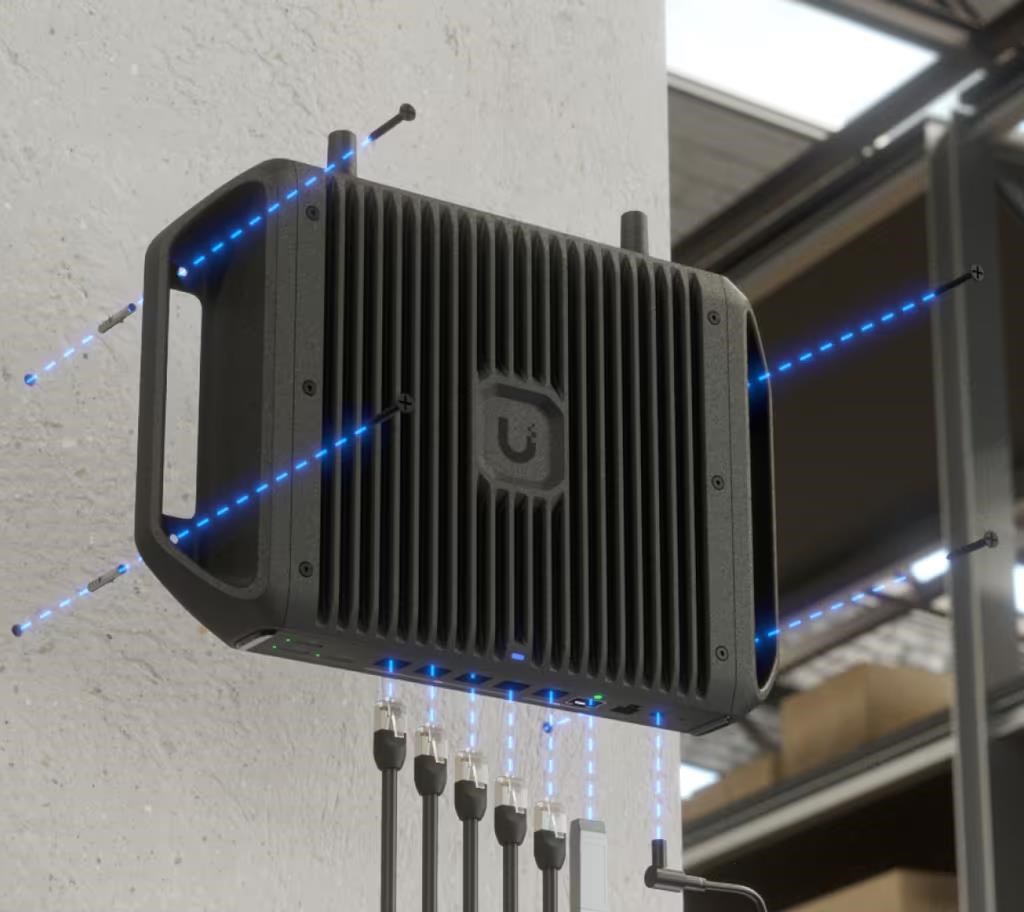 Ruggedized, fanless 10 GbE UniFi Cloud Gateway delivering 350W of total system power for high-density PoE deployments, with advanced routing capabilities and microSD storage for full UniFi application support..