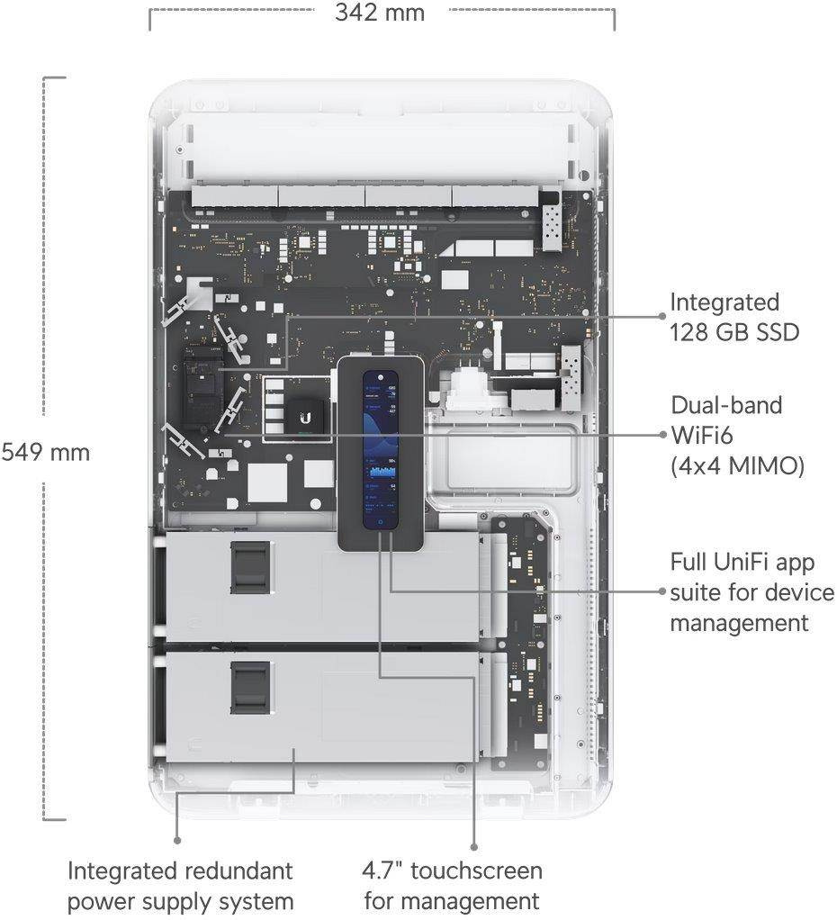 Popis produktu Dream Wall je další z řady zařízení UniFi All-in-one. Ukrývá v sobě bránu s firewallem, Wi-Fi 6 access point, NVR a switch s funkcí PoE. Jednotka poskytuje široké možnosti připojení do sítě. Nabízí možnost připojení 10Gbps SFP+ portem nebo ethernetovým portem 2.5Gbps. Pro připojení dalších zařízení v síti LAN pak nabízí 10Gbps SFP+ port spolu se 17 ethernetovými 1Gbps porty, z nichž 12 disponuje funkcí PoE (4x POE++, 4x POE+ a 4x POE). Z výroby je zařízení osazeno jedním hot-swap zdrojem s výkonem 550W a k dispozici je druhá pozice pro redundanci. Maximální spotřeba zařízení činí 532W včetně připojených napájených zařízení. Radiová část podporuje nejnovější standard WiFi 6 (802.11ax), je zpětně kompatibilní se staršími standardy a disponuje technologií MIMO 2x2 (2.4 Ghz) a 4x4 (5 GHz) s maximální modulační rychlostí 300 + 2400 Mbps. Ke všem důležitým informacím o zařízení a síti se dostanete ihned díky integrovanému displeji s úhlopříčkou 4,7". Pro ukládání kamerových záznamů slouží předinstalovaná 512GB microSD karta a zařízení disponuje také vlastním SSD diskem s kapacitou 128GB. Podporované UniFi služby • UniFi Network Controller • UniFi Protect • UniFi Access • UniFi Talk • UniFi Connect Výhody UniFi řešení • Zero Handoff Roaming - bezvýpadkový přechod mezi jednotlivými AP • Wireless uplink (hodí se tam, kam není možné dostat datový kabel) • Až 4 SSID • Detailní statistiky provozu • Guest síť • Load balance - udržování rovnoměné zátěže / přepínání klientů • Omezování rychlosti pro každé SSID Technické parametry Bezdrátové vlastnosti Bezdrátové frekvence:2.4 + 5 GHz (dual band) WiFi standardy:802.11n, 802.11a, 802.11ac, 802.11b/g, 802.11ax Přenosová rychlost - 5GHz [Mb/s]:2402 Přenosová rychlost - 2.4GHz [Mb/s]:300 Vysílací výkon 2.4GHz [dBm]:23 Vysílací výkon 5GHz [dBm]:26 Šifrování:WEP, WPA, WPA2, WPA3 2.4GHz MIMO:2 x 2 5GHz MIMO:4 x 4 Typ antény:Vestavěná Roaming:Ano Zisk antény [dBi]:6 Konektory a rozhraní Rychlosti WAN:(1) 100/1000/2500Mbps Slot na paměťové karty:microSD - až 512GB Rychlost LAN:(17) 10/100/1000Mbps Gigabit LAN:Ano Optické rozhraní:(2) 10Gbps Ostatní:Dotykový displej, Bluetooth Napájení Typ napájení:Ze sítě (230V) Typy PoE:PoE-Out (pouze) Podporované PoE-Out standardy:802.3af, 802.3at, 802.3at - ultra PoE (60W) Redundantní napájení:Ano Počet PoE Out portů:12 PoE budget [W]:422 Max. spotřeba energie [W]:532 Napájení přes konektor/svorkovnici:230V AC Fyzické charakteristiky Provedení:Na zeď Použití:Vnitřní Tlačítka:Reset Provozní teplota [°C]:-10 až 40 Hmotnost [g]:8600 Šířka [mm]:342 Výška [mm]:549 Hloubka [mm]:62 Hardware CPU:ARM Cortex-A57 Frekvence CPU [MHz]:1700 Počet CPU jader:4 RAM [MB]:4096 Software Předinstalovaný kontroller:UniFi Protect, UniFi controller Operační mód:AP Router Management:UniFi controller Výchozí IP adresa:192.168.1.1 Výchozí jméno a heslo:Nastavuje se při prvním spuštění.