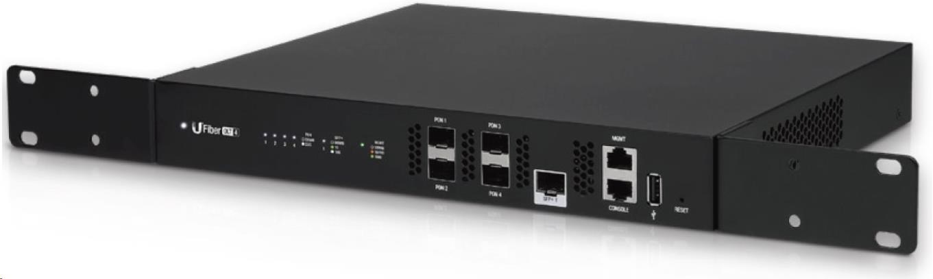 UFiber OLT 4 nabízí 4 GPON porty a podporuje až 128 klientů na port, celkově až 512 souběžných klientů s fyzickými linkami do vzdálenosti 20 km.
