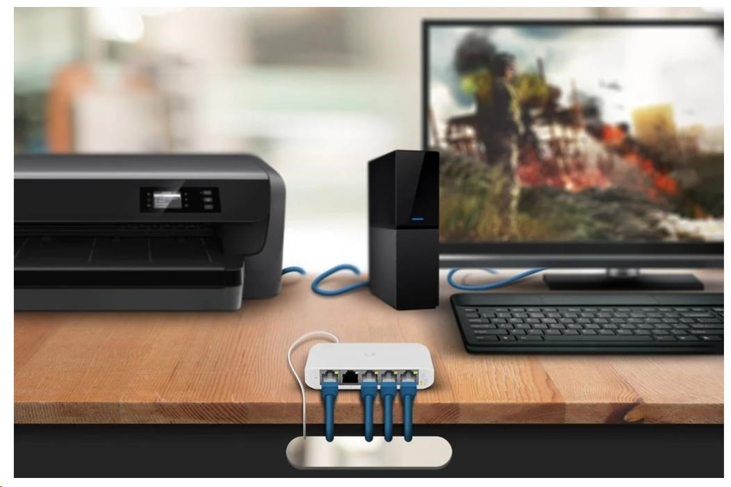 USW-Flex-Mini je maličký 5-portový Gigabitový switch se správou přes UniFi Controller od Ubiquiti Networks v desktop provedení s prvním portem podporující PoE In.