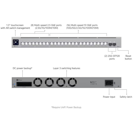 Popis produktu UniFi Switch USW-Pro-XG-24 je managovatelný L3 Switch s kapacitou přepínání 460 Gbps, (16) 2.5-Gigabit LAN, (32) 10-Gigabit LAN porty a (4) SFP28 (25G/10G/1G) porty. Ethernetové porty disponují funkcí Etherlighting, která Vám umožňuje barevně rozsvěcet porty pro zobrazení umístění portu, rychlosti/připojení a VLAN. Switch se napájí ze sítě 230V AC a jako záloha pro případ selhání primárního napájení slouží USP RPS DC port. Maximální spotřeba je 250W. Klíčové vlastnosti • (16) 2.5G portů • (32) 10G portů • (4) 25/10/1G SFP28 porty • Etherlighting - světelné zobrazení informací o portu • Montáž do racku • Správa pomocí UniFi Network Server Správa přes UniFi Network server USW-Pro-XG-24 nemá webový management ale je spravován centrálně pomocí UniFi Network Server s podporou mobilní aplikace UniFi a nabízí rozsáhlou sadu pokročilých přepínacích protokolů a funkcí L2 a L3, včetně provozního režimu (přepínání, zrcadlení nebo agregace) na port. UniFi Network Server a mobilní aplikace umožňují správcům konfigurovat a sledovat prakticky všechny funkce přepínače v grafickém uživatelském rozhraní odkudkoli. Obsah balení • Zařízení • Napájecí kabel • Úchyty do racku Technické parametry Konektory a rozhraní Rychlost LAN:(16) 2.5G/1G/100M/10M + (32) 10G/5G/2.5G/1G/100M/10M Optické rozhraní:(4) 1/10/25Gbps Ostatní:Dotykový displej Napájení Typ napájení:Ze sítě (230V) Redundantní napájení:Ano Max. spotřeba energie [W]:250 Napájení přes konektor/svorkovnici:230V AC Fyzické charakteristiky Provedení:Rackmount Ventilátory:Ano Šasi:Kovové Tlačítka:Reset Provozní teplota [°C]:-5 až 40 Šířka [mm]:442 Výška [mm]:44 Hloubka [mm]:480 Obecné Rychlost přepínání [Gbps]:920 Tabulka MAC adres:128000 Rychlost předávání paketů [Mpps]:684 Software Management:UniFi Network Funkce:VLAN, DHCP snooping, L2, L3 Výchozí IP adresa:192.168.1.20, Dynamická z DHCP Výchozí jméno a heslo:ubnt / ubnt.