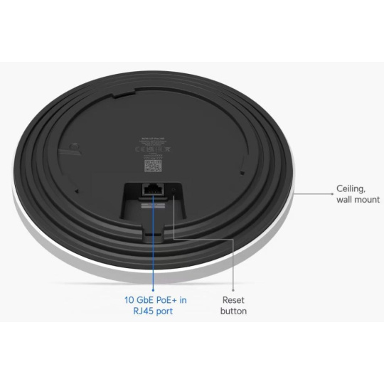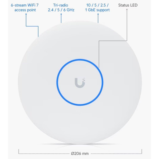 Popis produktu Ubiquiti U7-Pro-XG je nový WiFi 7 UniFi AP. Jedná se o tri-band access point s rychlostí přenosu 5,8Gbps v pásmu 6GHz, až 4,3Gbps v 5GHz pásmu a až 688 Mbps v pásmu 2,4GHz a pokročilým šifrováním WPA3. U7-Pro-XG je určeno k WiFi pokrytí vaší domácnosti, kanceláře, hotelových prostor nebo skladu s podporou až 300+ připojených klientů. Plná podpora roamingu zajišťuje plynulé předávání připojených klientů mezi jednotlivými AP. Pro připojení do sítě je AP vybaveno 10G ETH portem, který slouží i pro napájení pomocí PoE 802.3at nebo pasivním PoE v rozsahu 42,5-57V DC, PoE injektor není součástí balení. Výhody UniFi řešení • Roaming - přechod mezi jednotlivými AP bez výpadků • Wireless uplink – ideální pro místa, kam nelze přivést datový kabel • Až 8 SSID • Detailní statistiky provozu • Guest síť • Load balancing - udržování rovnoměné zátěže / přepínání klientů • Omezování rychlosti pro každé SSID Obsah balení • Zařízení • Kit k přichycení na strop • Sada šroubků Technické parametry Bezdrátové vlastnosti Bezdrátové frekvence:2.4 + 5 + 6 GHz (triple band) WiFi standardy:802.11n, 802.11a, 802.11ac, 802.11b/g, 802.11ax, 802.11be MU-MIMO:Ano Přenosová rychlost - 5GHz [Mb/s]:4300 Přenosová rychlost - 2.4GHz [Mb/s]:688 Přenosová rychlost - 6GHz [Mb/s]:5800 Vysílací výkon 2.4GHz [dBm]:23 Vysílací výkon 5GHz [dBm]:26 Vysílací výkon 6GHz [dBm]:24 Šifrování:WPA, WPA2, WPA3 2.4GHz MIMO:2 x 2 5GHz MIMO:2 x 2 6GHz MIMO:2 x 2 Typ antény:Vestavěná Počet vestavěných antén:6 Roaming:Ano Zisk antény [dBi]:6, 4, 5 Konektory a rozhraní Rychlost LAN:(1) 100M/1G/2.5G/5G/10G Gigabit LAN:Ano Napájení Napájení přes PoE:802.3at, 42 .. 57V DC Typy PoE:PoE-In (pouze) Max. spotřeba energie [W]:22 Fyzické charakteristiky Použití:Vnitřní Tlačítka:Reset Provozní teplota [°C]:-30 až 40 Hmotnost [g]:750 Šířka [mm]:206 Výška [mm]:206 Hloubka [mm]:33 Software Operační mód:Access Point Výchozí IP adresa:192.168.1.20, Dynamická z DHCP.