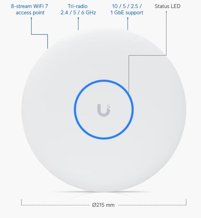 Popis produktu Ubiquiti U7 Pro XGS je nový WiFi 7 UniFi AP. Jedná se o tri-band access point s rychlostí přenosu 5,8Gbps v pásmu 6GHz, až 8,6Gbps v 5GHz pásmu a až 688 Mbps v pásmu 2,4GHz a pokročilým šifrováním WPA3. U7-Pro-XGS je určeno k WiFi pokrytí vaší domácnosti, kanceláře, hotelových prostor nebo skladu s podporou až 500+ připojených klientů. Plná podpora roamingu zajišťuje plynulé předávání připojených klientů mezi jednotlivými AP. Pro připojení do sítě je AP vybaveno 10G ETH portem, který slouží i pro napájení pomocí PoE 802.3at nebo pasivním PoE v rozsahu 42,5-57V DC, PoE injektor není součástí balení. Výhody UniFi řešení • Roaming - přechod mezi jednotlivými AP bez výpadků • Wireless uplink – ideální pro místa, kam nelze přivést datový kabel • Až 8 SSID • Detailní statistiky provozu • Guest síť • Load balancing - udržování rovnoměné zátěže / přepínání klientů • Omezování rychlosti pro každé SSID Obsah balení • Zařízení • Kit k přichycení na strop • Sada šroubků Technické parametry Bezdrátové vlastnosti Bezdrátové frekvence:2.4 + 5 + 6 GHz (triple band) WiFi standardy:802.11n, 802.11a, 802.11ac, 802.11b/g, 802.11ax, 802.11be MU-MIMO:Ano Přenosová rychlost - 5GHz [Mb/s]:8600 Přenosová rychlost - 2.4GHz [Mb/s]:688 Přenosová rychlost - 6GHz [Mb/s]:5800 Vysílací výkon 2.4GHz [dBm]:23 Vysílací výkon 5GHz [dBm]:29 Vysílací výkon 6GHz [dBm]:24 Šifrování:WPA, WPA2, WPA3 2.4GHz MIMO:2 x 2 5GHz MIMO:4 x 4 6GHz MIMO:2 x 2 Typ antény:Vestavěná Počet vestavěných antén:8 Roaming:Ano Zisk antény [dBi]:6, 4 Konektory a rozhraní Rychlost LAN:(1) 100M/1G/2.5G/5G/10G Gigabit LAN:Ano Napájení Napájení přes PoE:802.3at, 42 .. 57V DC Typy PoE:PoE-In (pouze) Max. spotřeba energie [W]:29 Fyzické charakteristiky Použití:Vnitřní Tlačítka:Reset Provozní teplota [°C]:-30 až 40 Hmotnost [g]:800 Šířka [mm]:215 Výška [mm]:215 Hloubka [mm]:33 Software Operační mód:Access Point Výchozí IP adresa:192.168.1.20, Dynamická z DHCP.