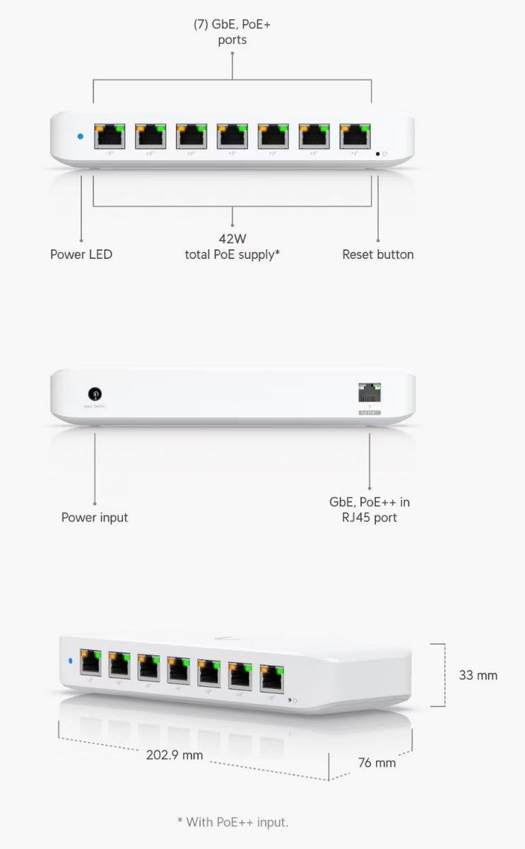 Popis produktu Kompaktní 8 portový gigabitový PoE switch. Switch disponuje 1 PoE in portem a 7 PoE out porty s podporou PoE napájení 802.3af/at s maximálním zatížením až 30W na port. Switch je spravován pomocí aplikace UniFi network umožňující centrální správu Vaší sítě včetně cloudového přístupu. Maximální PoE budget switche je závislý na způsobu napájení: • při napájení DC adaptérem 54V/3,9A (není součástí balení) je PoE budget 52W • při napájení pasivním PoE adaptérem nebo 60W PoE++ adaptérem je PoE budget 45W Obsah balení • switch • montážní set Technické parametry Konektory a rozhraní Rychlost LAN:(8) 10/100/1000Mbps Napájení Typ napájení:DC konektor, PoE Typy PoE:PoE-Out + PoE-In Podporované PoE-Out standardy:802.3af, 802.3at Počet PoE Out portů:7 PoE budget [W]:52 Max. spotřeba energie [W]:60 Napájení přes konektor/svorkovnici:44 .. 57V DC Fyzické charakteristiky Provedení:Na zeď, Desktop Ventilátory:Bez ventilátoru Šasi:Plastové Tlačítka:Reset Provozní teplota [°C]:-15 až 45 Šířka [mm]:203 Výška [mm]:33 Hloubka [mm]:76 Obecné Rychlost přepínání [Gbps]:8 Software Management:UniFi controller Funkce:VLAN.