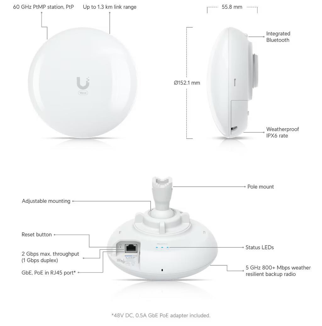 Popis produktu Ubiquiti Wave-Pico je 60 GHz point-to-multipoint (PtMP) klientské zařízení s vestavěnou založní 5GHz Wifi 6 (802.11ax). Maximální dosah při použití s Wave AP je 1,3 km a při použití s Wave AP Micro 0,9 km. Propustnost zařízení je 2 Gb/s(1 Gb/s duplex) při použití 5 GHz pouze 800 Mb/s. Pro připojení do sítě je zde LAN port o rychlosti 1 Gb/s podporující PoE 48V DC. Pro zjednodušení nastavení je zařízení vybaveno integrovaným Bluetooth k připojení do UISP mobilní aplikace, nebo je zde možnost nastavovaní přes běžné webové rozhraní. Klíčové vlastnosti • Dosah až 1,3 km při použití s Wave AP • Napájení přes PoE • Propustnost v pásmu 60 GHz 2000 Mb/s, v pásmu 5 GHz až 800 Mb/s • Integrované Bluetooth pro nastavení přes mobilní aplikaci UISP * Vzdálenost je závislá na celkovém vyzářeném výkonu, který se může v jednotlivých státech lišit Legislativa v ČR Instalování a provozování pojítka je potřeba vykonávat v souladu s platným všeobecným oprávněním. Wave-Nano je certifikováno podle normy ETSI EN 303 722 a určeno jako klient v instalacích bod - multibod. Provoz těchto zařízení je tak možný podle VO-R/12, řádku d4 tabulky b) technické parametry stanic. • Všeobecné oprávnění č. VO-R/12 Před uvedením pojítka do provozu je třeba jej nejprve zaregistrovat na portálu 60ghz.ctu.cz v souladu s VO-R/12. Obsah balení • Zařízení • Držák zařízení pro sluup o průměru 20 až 53 mm • Gigabitový adaptér 48V DC 0.5A • QuickStart Technické parametry Bezdrátové vlastnosti Přenosová rychlost - 5GHz [Mb/s]:800 Přenosová rychlost - 60GHz [Mb/s]:2000 Šifrování:WPA2 AES Vyzař. úhel v elevační rovině (-6dB) [°]:6 Vyzař. úhel v azimutové rovině (-6dB) [°]:6 Zisk antény [dBi]:9, 25,7 Konektory a rozhraní Rychlost LAN:(1) 10/100/1000Mbps Ostatní:Bluetooth Napájení Napájení přes PoE:Ano, 48V DC Typ napájení:PoE Max. spotřeba energie [W]:10 Fyzické charakteristiky Určeno na stožár o průměru [mm]:20 až 53 Stupeň krytí:IPX6 Provozní teplota [°C]:-40 až 60 Hmotnost [g]:410 Šířka [mm]:152 Výška [mm]:56 Hloubka [mm]:152 Hardware RAM [MB]:512 Software Výchozí IP adresa:192.168.1.20 Výchozí jméno a heslo:ubnt / ubnt.
