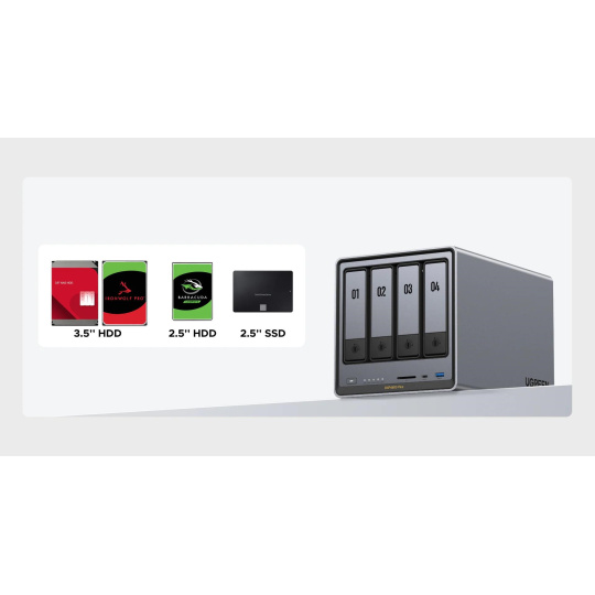 UGREEN NAS je kompatibilní s extrémně širokou škálou úložných disků, včetně 3,5„/2,5“ SATA disků a M.2 SSD. Podporovány jsou všechny nejoblíbenější značky pevných disků a neexistuje žádné omezení na konkrétního výrobce.