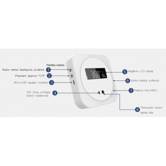 OHE-TWP02-D je velmi jednoduché zařízení, sloužící k rychlému orientačnímu měření teploty člověka ze zápěstí. Terminál lze provozovat ve třech různých režimech provozu • Automatický • Měření teploty a vlhkosti prostředí • Režim měření tělesné teploty. Pro správnou funkčnost zařízení terminál disponuje dvěma senzory teploty a jedním senzorem vlhkosti. Při zvolení Automatického režimu se Terminál, v případě potřeby měření tělesné teploty, přepíná okamžitě a to na základě integrovaného ToF (Time of Flight) snímače. ToF snímač detekuje IR záření spektra vyzařovaného z povrchu lidského těla. OHE-TWP02-D-S31 je určen pro vnitřní nenáročné aplikace s nízkou průchodností osob, jako jsou komunity, kanceláře, domácnosti a podobně. Provozovat lze pouze ve vnitřním tepelně a emisně stabilním prostředí mimo průvan a povětrnostní vlivy. Není určen pro měření osob bezprostředně po příchodu z venkovních prostor (z velmi chladných, nebo naopak teplých prostor). V případě příchodu z venkovních prostor je doporučeno vyčkat 1 minutu v místnosti s terminálem pro stabilizaci teploty povrchu těla. Zařízení postrádá pravidelnou automatickou dokalibraci senzoru s okolním prostředím. Díky tomu nemůže nahradit profesionální vstupní systémy s měřením teploty. Zařízení je dodáváno bez USB zdroje, pouze s napájecím kabelem microUSB-USB..