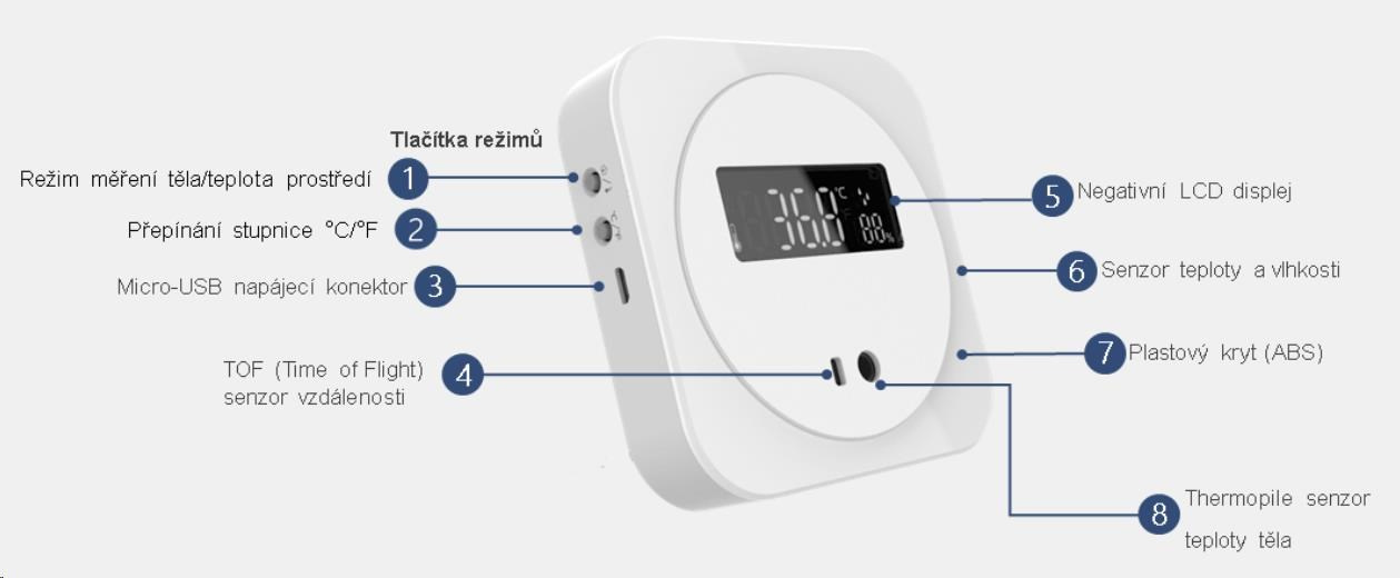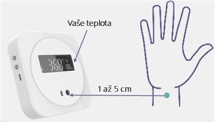 OHE-TWP02-D je velmi jednoduché zařízení, sloužící k rychlému orientačnímu měření teploty člověka ze zápěstí. Terminál lze provozovat ve třech různých režimech provozu • Automatický • Měření teploty a vlhkosti prostředí • Režim měření tělesné teploty. Pro správnou funkčnost zařízení terminál disponuje dvěma senzory teploty a jedním senzorem vlhkosti. Při zvolení Automatického režimu se Terminál, v případě potřeby měření tělesné teploty, přepíná okamžitě a to na základě integrovaného ToF (Time of Flight) snímače. ToF snímač detekuje IR záření spektra vyzařovaného z povrchu lidského těla. OHE-TWP02-D-S31 je určen pro vnitřní nenáročné aplikace s nízkou průchodností osob, jako jsou komunity, kanceláře, domácnosti a podobně. Provozovat lze pouze ve vnitřním tepelně a emisně stabilním prostředí mimo průvan a povětrnostní vlivy. Není určen pro měření osob bezprostředně po příchodu z venkovních prostor (z velmi chladných, nebo naopak teplých prostor). V případě příchodu z venkovních prostor je doporučeno vyčkat 1 minutu v místnosti s terminálem pro stabilizaci teploty povrchu těla. Zařízení postrádá pravidelnou automatickou dokalibraci senzoru s okolním prostředím. Díky tomu nemůže nahradit profesionální vstupní systémy s měřením teploty. Zařízení je dodáváno bez USB zdroje, pouze s napájecím kabelem microUSB-USB..