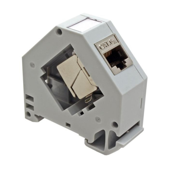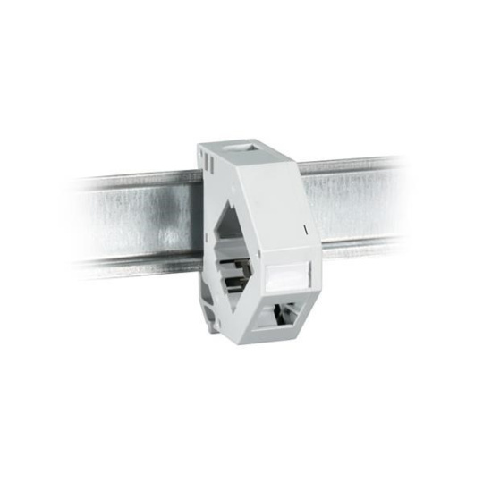 Plastový držák pro 1 keystone na DIN lištu. Integrovaný kovový pásek zajišťuje uzemnění keystone modulu. Štítek pro popis (vyjímá se po sejmutí bočního krytu)..