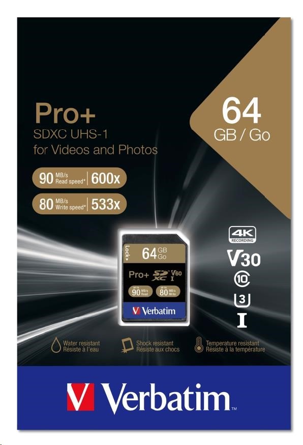 VERBATIM SDXC karta 64GB PRO+ Class 10, UHS-1 (R:90/W:80 MB/s)