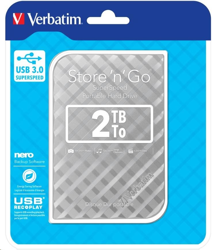 VERBATIM HDD 2.5" 2TB Store 'n' Go Portable Hard Drive USB 3.0, Silver Special Features: Colours available: Black, Silver, White, Red & Blue Capacities available: 500GB, 1TB & 2TB High speed, high capacity storage. A fast & safe solution to expand storage or backup files USB 3.0 SuperSpeed - for ultra fast data transfer Nero Backup Software Energy Saving Software USB REC & PLAY* - supports USB recording/ playback 2 year limited warranty** System requirements: PC or Mac with USB 3.0 Windows XP / Vista / Windows 7 & 8 Mac OS X 10.4 or higher Pack Contents: Portable Hard Drive / USB 3.0 Cable / Nero Backup Software / Green Button Energy Saving Software / Verbatim Formatter / Quick Start Guide / User Guide (pre-loaded on the drive).