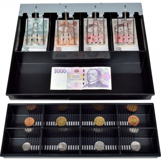Vyjímatelný mincovník a pořadač bankovek s libovolně nastavitelnými přihrádkami