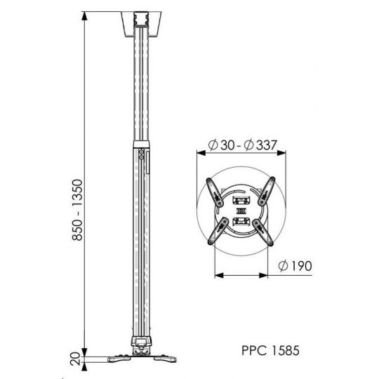 PPC 1585 Professional Teleskopický stropní držák na projektor 85-135 cm Teleskopický stropní držák na projektor do 20 kg ideální pro montáže, kde není přesně známa výška stropu nastavitelná výška 85-135 cm vyhovuje prakticky všem malým a středním projektorům do 20 kg 4 nastavitelná montážní ramena s dosahem 30-337 mm ... více