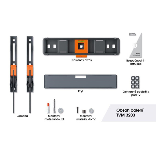 Tento nástěnný držák televizoru z řady COMFORT Fixed je ideálním řešením, pokud chcete televizor bezpečně a stylově připevnit na zeď. Nástěnný TV držák je vhodný pro televizory s úhlopříčkou od 19 do 50 palců a hmotností do 30 kg. Mezi televizorem a stěnou je vzdálenost pouhých 2,2 cm. Nástěnný držák televizoru TVM 3203 je pevný držák, který nelze otáčet ani naklápět. Ideální volba, pokud sedíte přímo před televizorem.