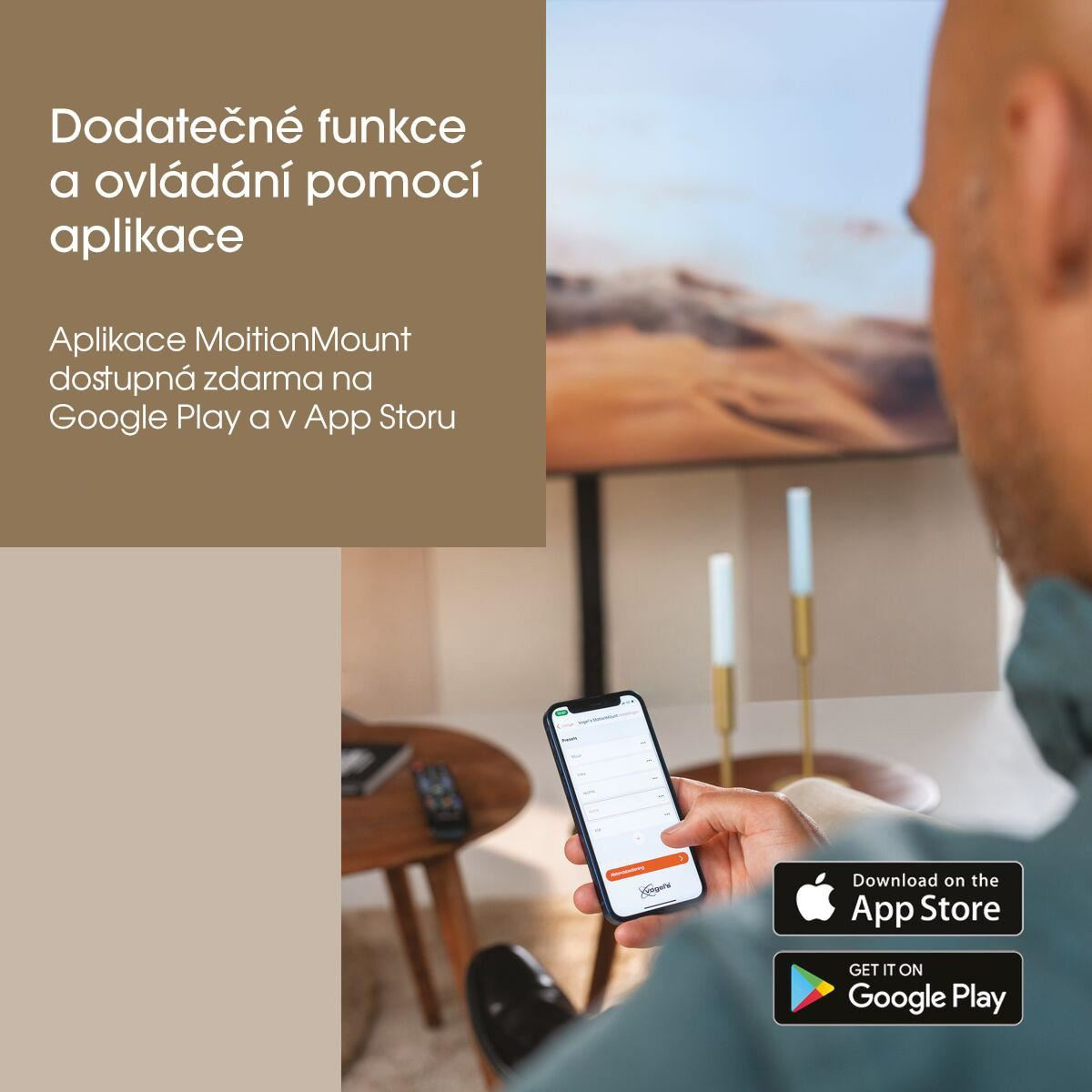 Nemusíte vstávat z pohodlného křesla. Jakmile televizor zapnete, držák se automaticky natočí do přednastavené polohy. Chcete natočit obrazovku? Pomocí hlasu (hlasové ovládání Siri, založené na zkratkách Siri) přesuňte obrazovku do jedné z vašich předvolených pozic. Nebo držák snadno ovládejte pomocí dálkového ovladače nebo prostřednictvím zdarma stažitelné aplikace MotionMount v telefonu nebo tabletu (iOS nebo Android). Celkem můžete vytvořit a nastavit 7 různých preferovaných pozic.