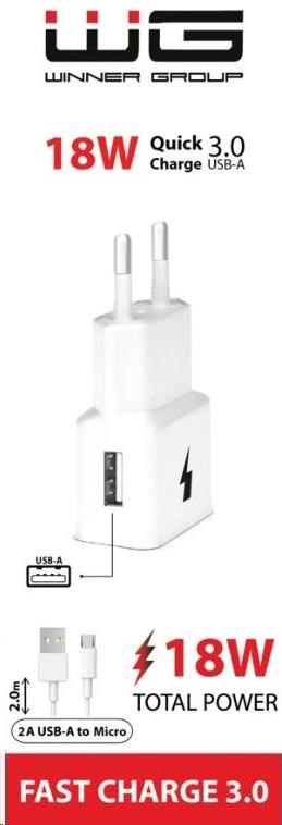WG - Síťová nabíječka 1x USB-A, Quick Charge 3.0, 5V-9V-12V + kabel USB-A na Micro USB, white