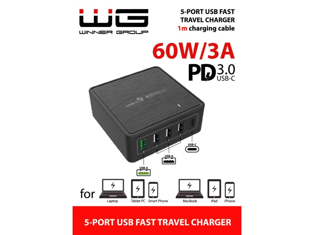WG - Síťová nabíječka 5x USB 60W, 1x USB-A QC 3.0 + 3x USB-A Smart IC + 1x USB-C PD, černá