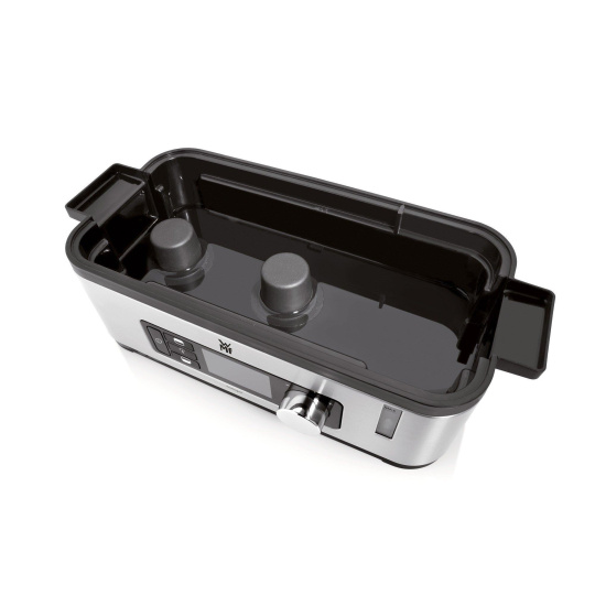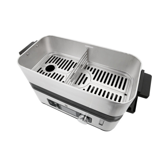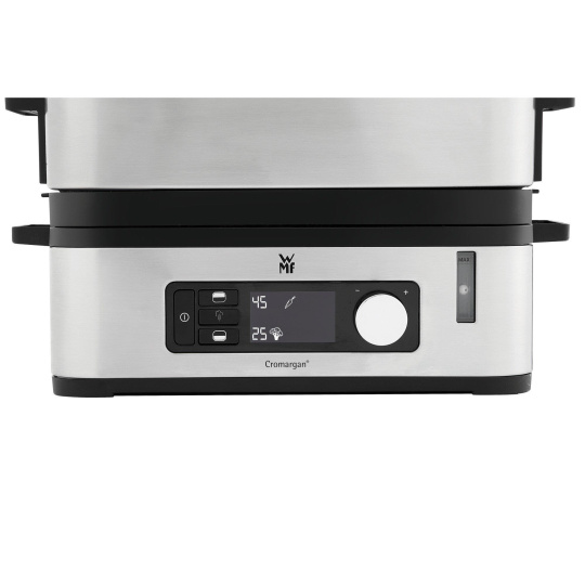 Parní hrnec WMF KITCHENminis® vyrobený z nerezové oceli Cromargan® s kvalitním skleněným víkem plní, co slíbil. Má kompaktní design, je vhodný na zdravé vaření, neobsahuje bisfenol A a není odkázaný na vařič. Jedná se o nejmenší systém na vaření z nerezové oceli Cromargan® o velikosti jen 14,4 x 28,4 cm s výkonem 900 wattů, který umožňuje připravovat zároveň maso, ryby, zeleninu a přílohy na dvou plochách. Dokonalé vaření: díky technologii WMF Easy Steaming se dvěma samostatnými plochami na přípravu pokrmů, které lze samostatně nastavit, můžete připravovat vše najednou. Samotný proces vaření však začíná později podle toho, jak ho nastavíte.