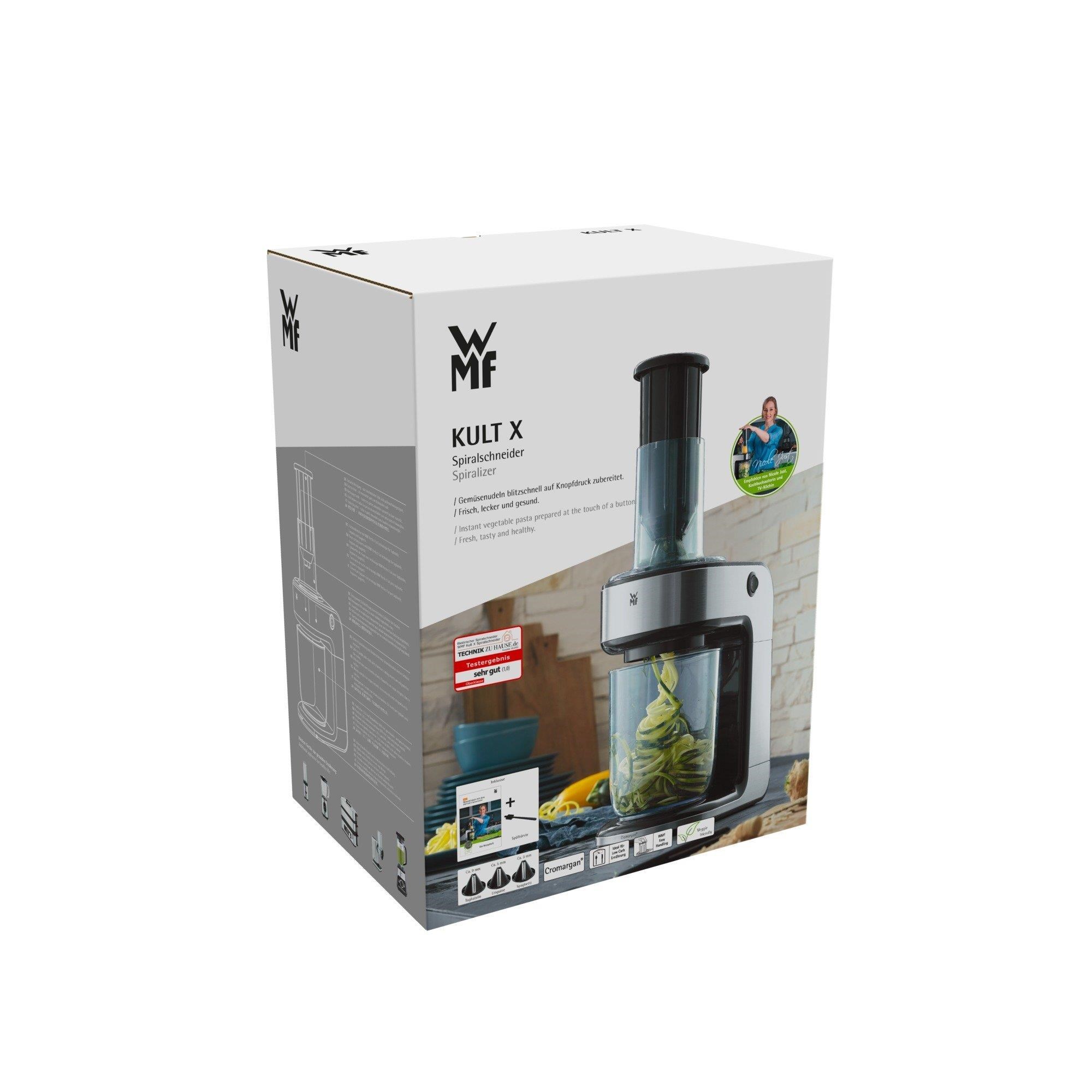 První elektrický spiralizér: v mžiku hotové zeleninové těstoviny stisknutím jednoho tlačítka. Spiralizér WMF Kult X se dokonale hodí na nízkosacharidové diety a zdravé stravování. Jako náhradu běžných těstovin, první elektrický spiralizér svého druhu nakrájí tvrdé ovoce a zeleninu na barevné a dekorativní spirálky mrknutím oka..... více